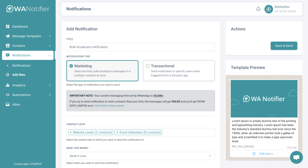 Create a message template from your WANotifier dashboard and send it to WhatsApp for approval. Once approved, you can send this template to your contacts.